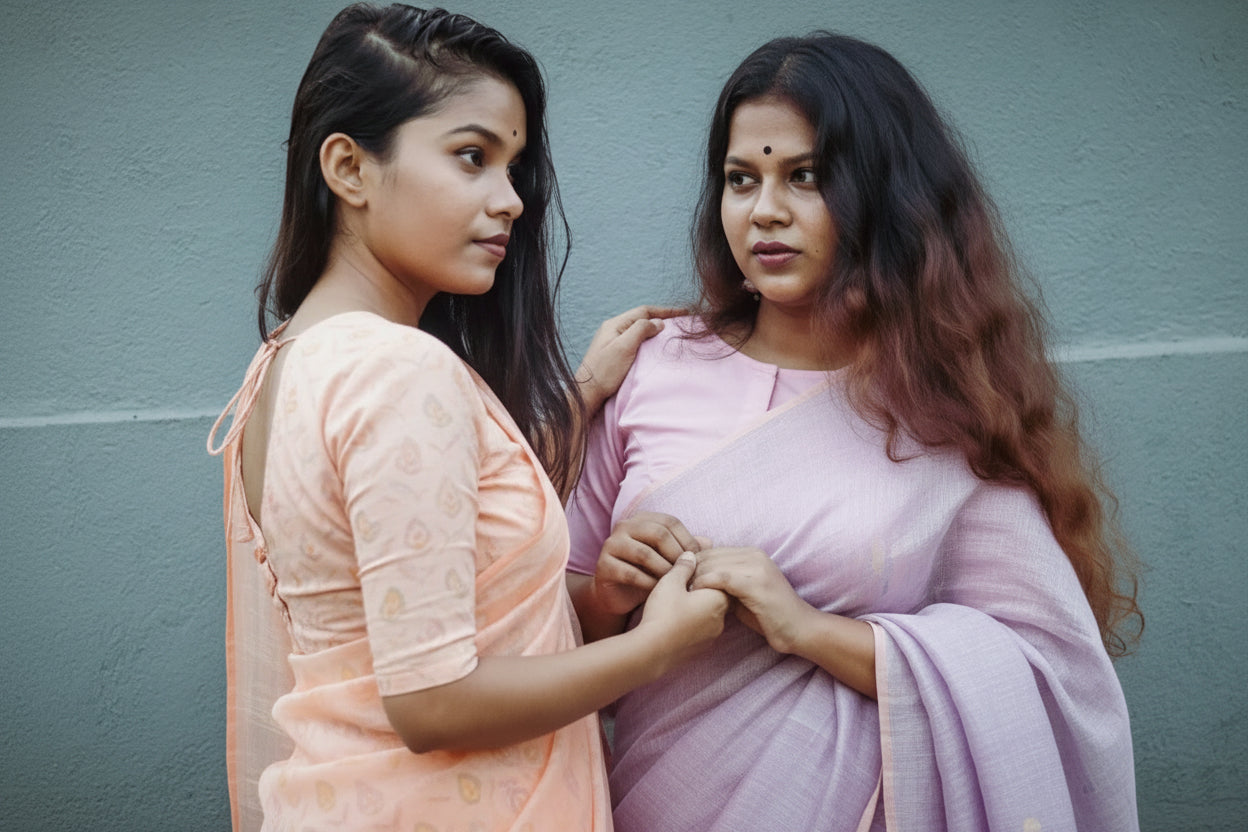- Drying: Always dry your sarees in the shade. Direct sunlight can fade the natural dyes of cotton and linen.